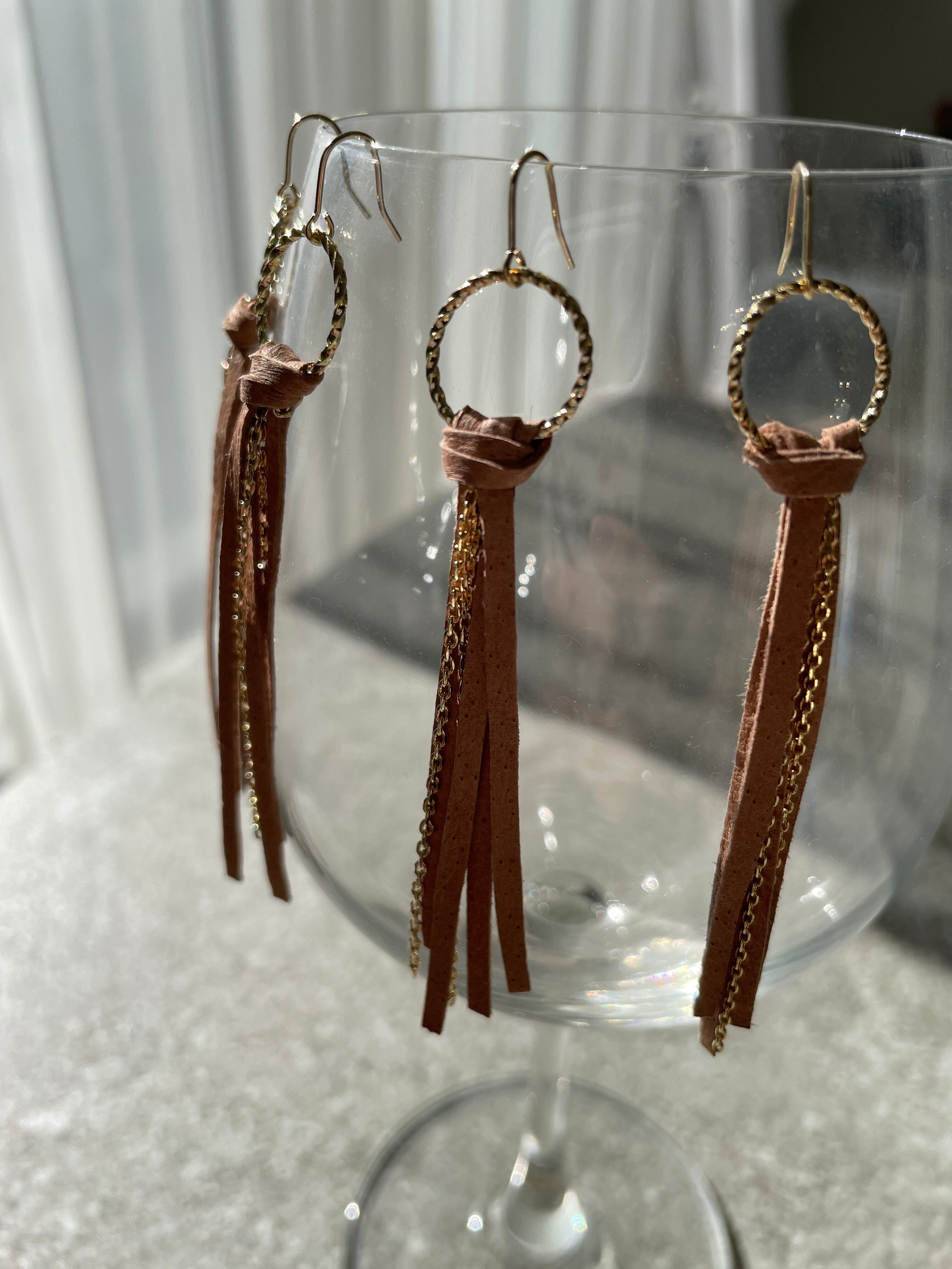肌なじみの良い、明るいベージュのピッグスキンを使用したフリンジピアスです。